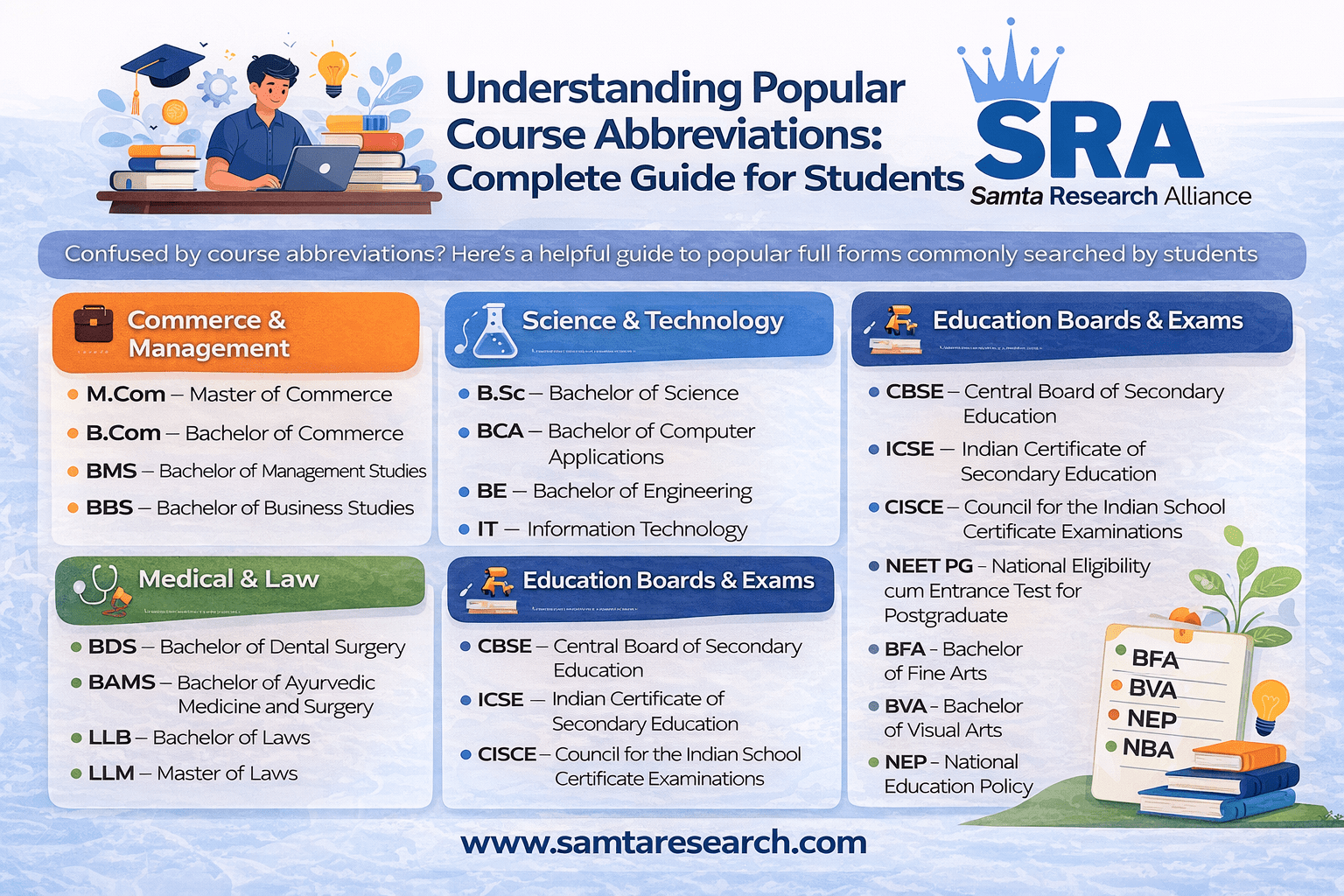 In today’s competitive academic world, students often look online for basic but vital information like the complete form of “m com,” “bds,” or “it.” We at Samta Research Alliance think that the first step to making confident career choices is to be clear. This resource lists the most prevalent degree acronyms and explains what they signify to help students make smart decisions.